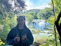 Student Brynn Haer poses in front of a waterfall while studying abroad in Bulgaria.